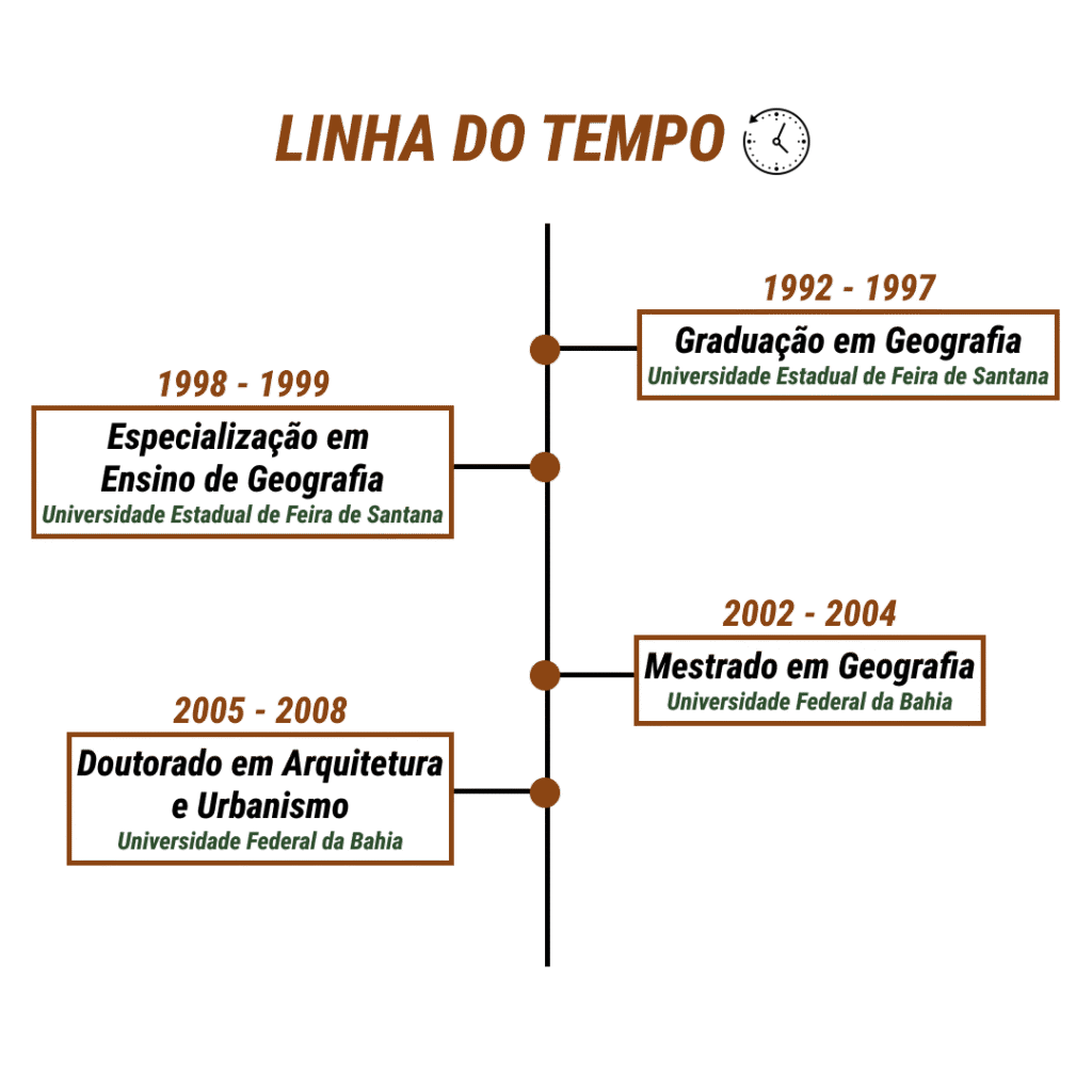 Após a graduação, realizou curso de Especialização em Geografia também na UEFS, consolidando e aprofundando sua formação na área, demonstrando desde o início de sua trajetória o comprometimento com a excelência acadêmica e o aperfeiçoamento contínuo.